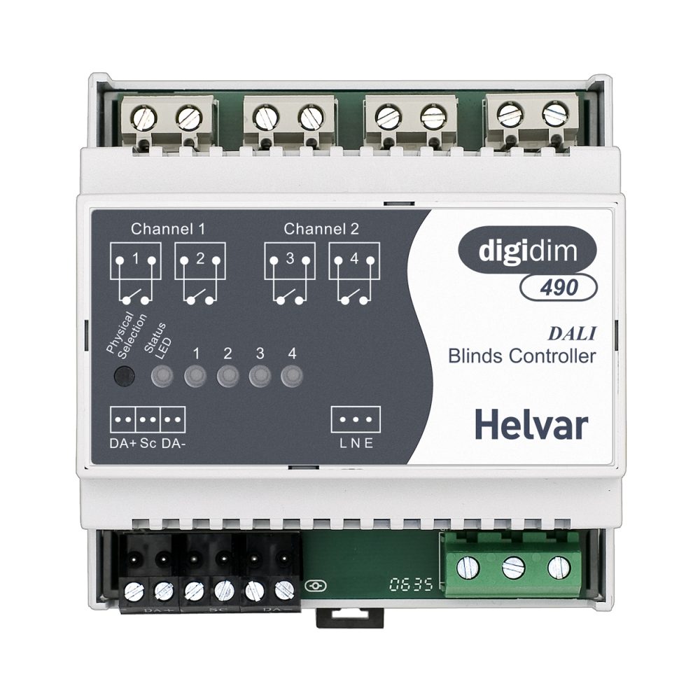 The 2-Channel 490 Blinds Controller is a DALI-compatible interface unit that allows control of blinds and curtains in a DIGIDIM lighting control system. The blinds controller is a DIN-rail mounted unit that provides two independent control channels, each with two single-pole, volt-free contacts for switching up to 550 W up/down or power direction motors from a DIGIDIM system.